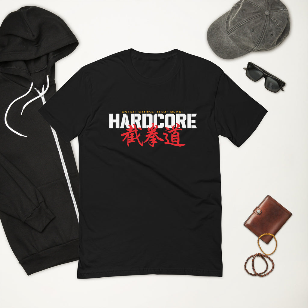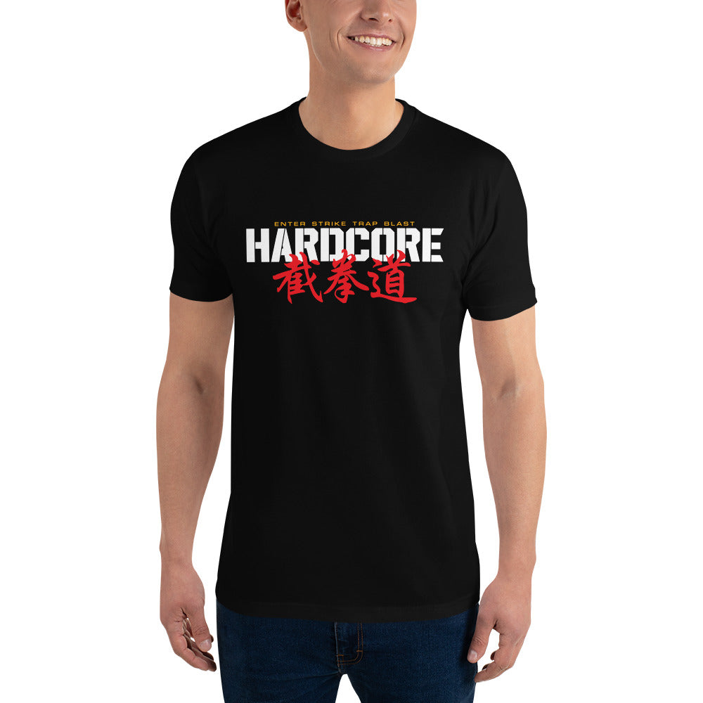This HARDCORE JKD design uses hand-painted calligraphy for the Jeet Kune Do characters and is paired with HARDCORE rendered in an edgy stencil design. Across the top in contrasting gold characters are the words ENTER, STRIKE, TRAP and BLAST. This design is printed on a heavyweight, athletic-fit tee.